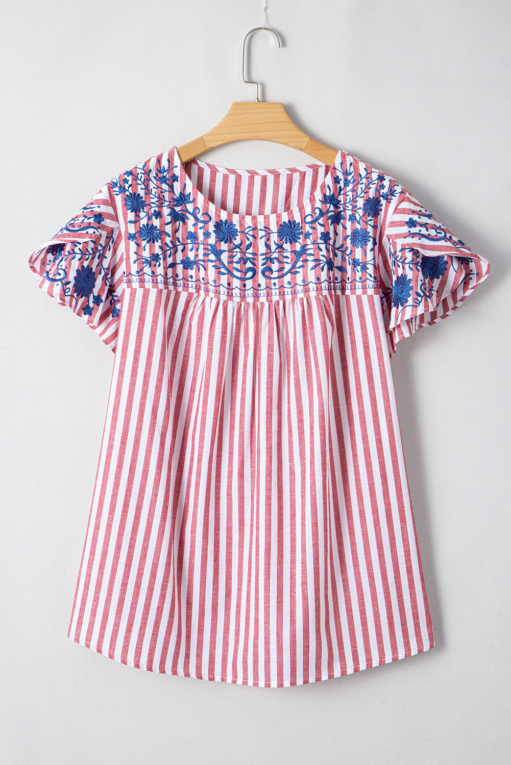 ① 《Classic Striped Design》: The Red Stripe Plus Size Floral Embroidered Petal Sleeve Blouse adds a timeless twist to your wardrobe, featuring charming stripes that never go out of style.