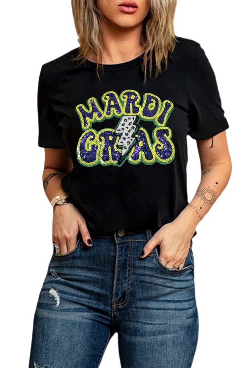 1. **Bold MARDI GRAS Graphic**: Make a statement with the eye-catching “MARDI GRAS” lettering displayed prominently on this Black Lightning Graphic Short Sleeve Top, perfect for showcasing your festive spirit.