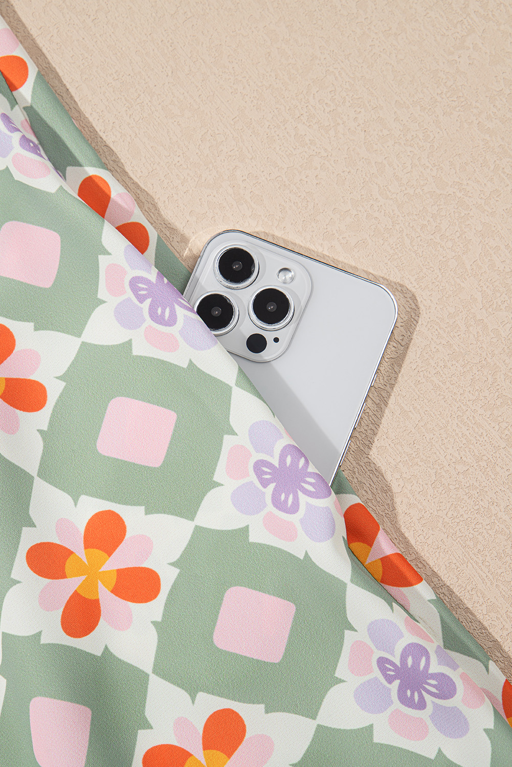⑤ 《Trendy 3/4 Sleeves》: The fashionable 3/4 sleeves enhance the overall silhouette, making this geometric floral print mini dress a standout piece in your wardrobe.