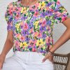① 《Vibrant Floral Print》: The Purple Floral Print Puff Short Sleeve Crew Neck Blouse showcases a charming and vibrant floral pattern, perfect for adding a touch of spring to your wardrobe.